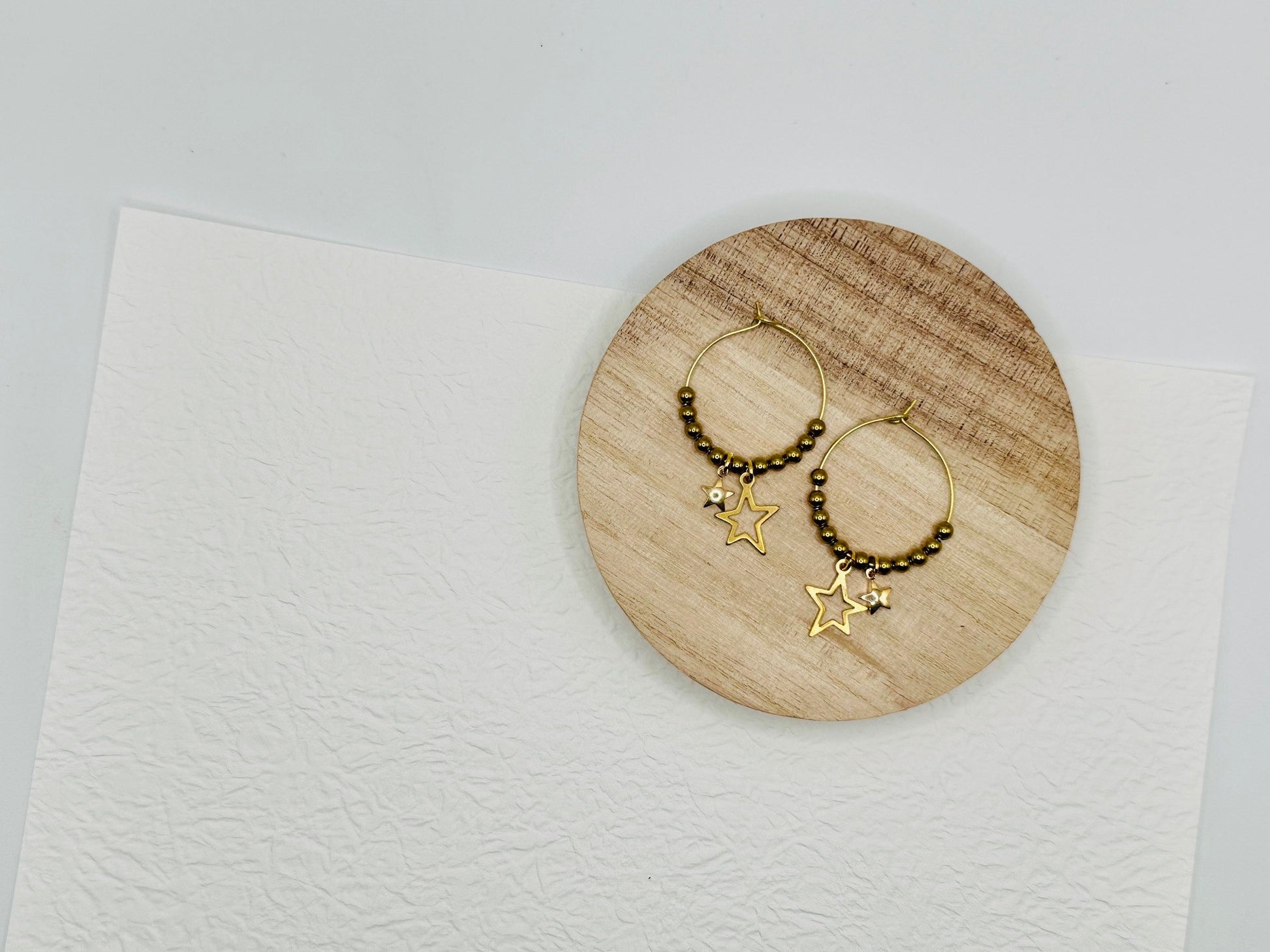 Brass hoops and star charms with hematite beads. Brass hoop.