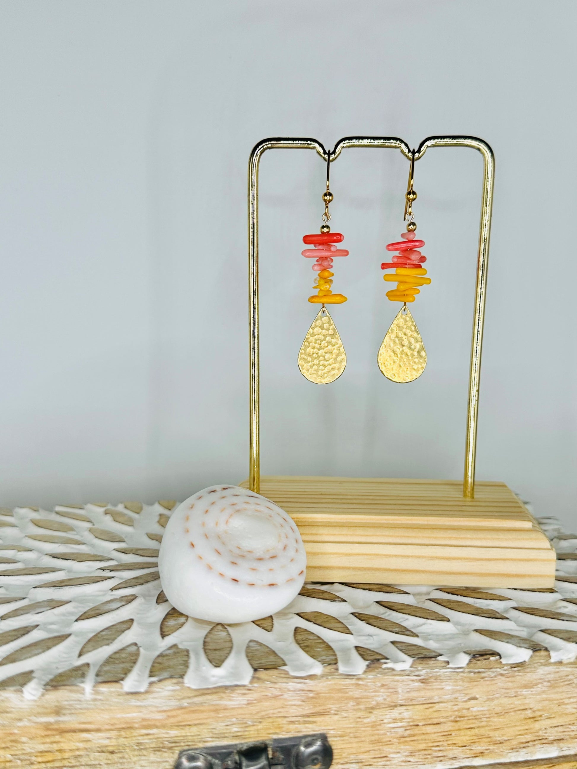 Bamboo Coral shell with brass teardrop. Gold-Plated hooks.