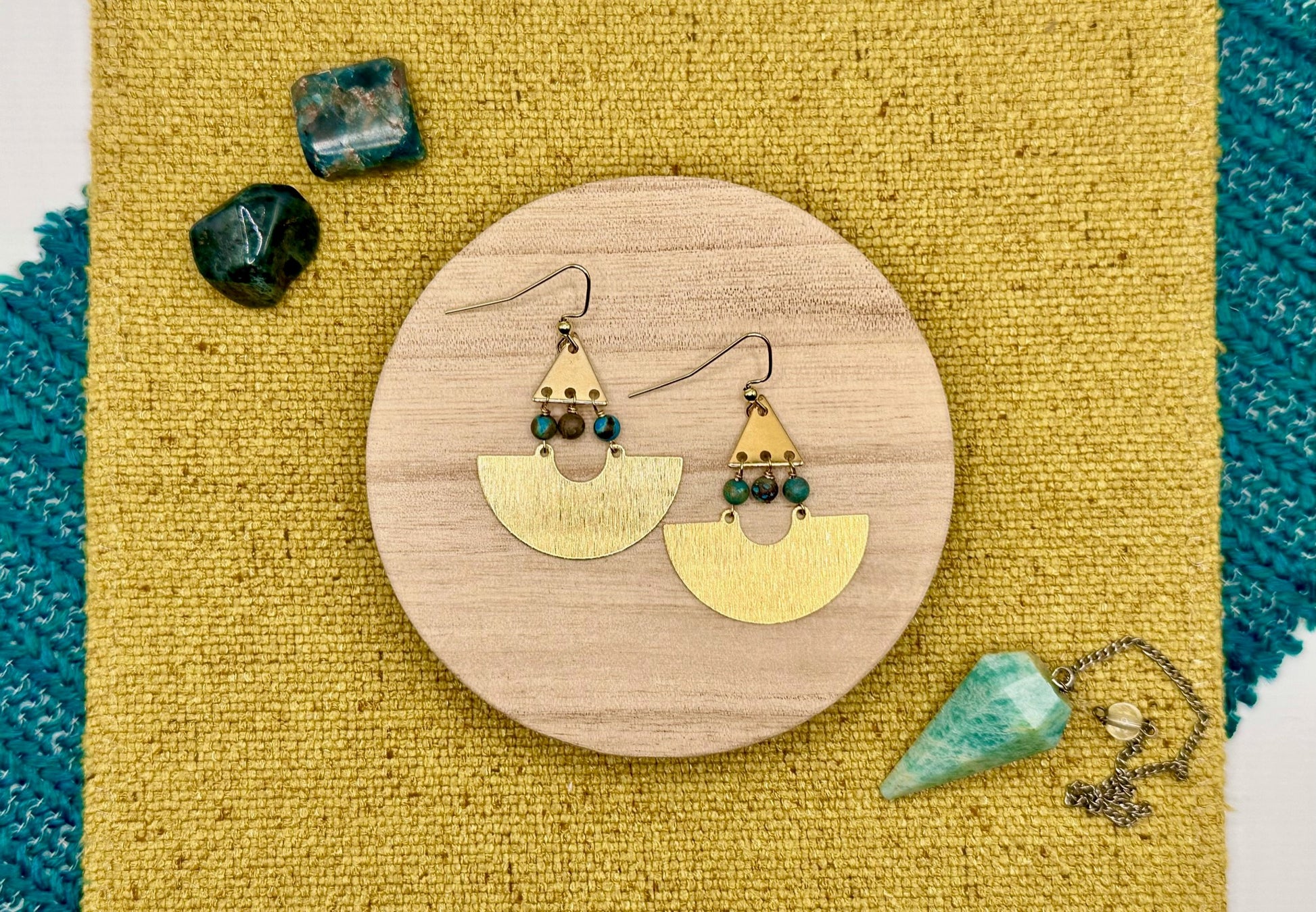 Brass components with accent gemstone beads. Gold-plated hooks.