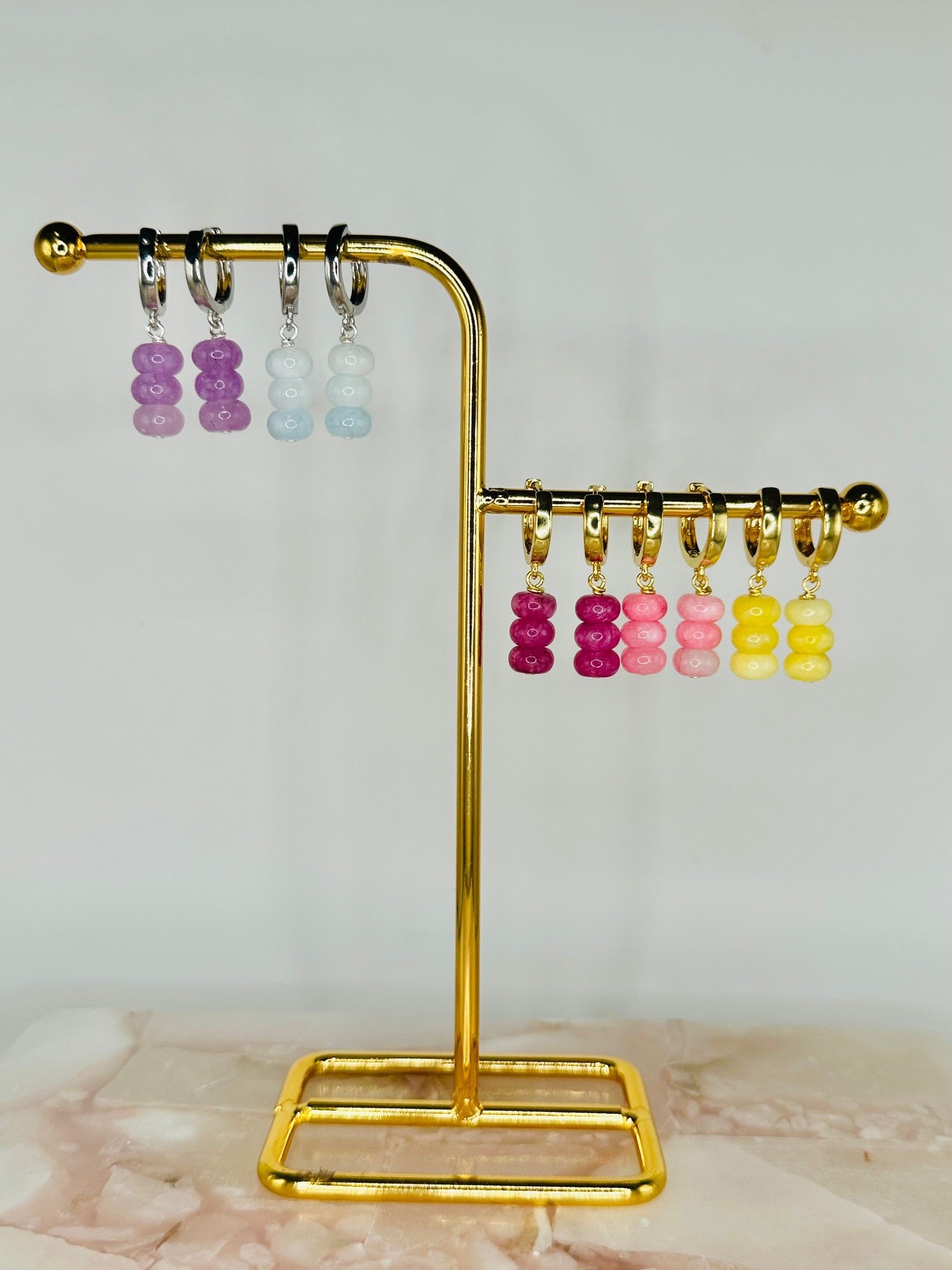 These cute huggies remind me of little gummy candies. These are available in various colors of dyed Jade in 3-bead stacks with gold or platinum plated huggie hoops.