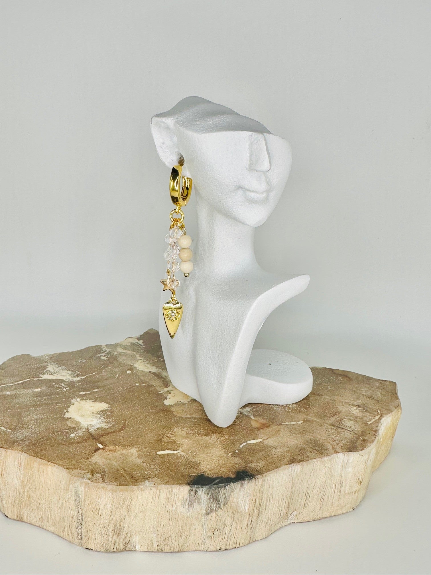 These dangling earrings are made with a faceted glass beaded chain, white fossil gemstones and brass star and evil eye heart charms. Finished with a gold-plated huggie hoop.